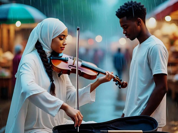 <p><br/></p><p>It was a rainy night in Lagos, and the streets were empty. Amina, a young artist, was walking home from her gallery job, lost in thought. She stumbled upon a forgotten violin case, tucked away in a corner. As she opened it, the rain-soaked streets faded away.</p><p><br/></p><p>The violin was old, with scratches telling stories of its own. Amina, a music lover, couldn't resist. She began to play, and the melody was like nothing she'd ever heard. The rain stopped, and people gathered, mesmerized.</p><p><br/></p><p>A young man, Osei, stood at the edge, captivated. He'd been searching for something to reignite his passion for life. The music spoke to him, and he found himself walking towards Amina.</p><p><br/></p><p>Their eyes met, and it was like time stopped. Amina's hands faltered, but Osei stepped closer, "Keep playing." The music swirled around them, a dance of notes and emotions.</p><p><br/></p><p>As the last note faded, Osei whispered, "I've been searching for you." Amina smiled, and they stood there, strangers bound by music.</p><p><br/></p><p>Weeks turned into months, and their love story unfolded like a melody. Osei, a writer, found inspiration in Amina's art. She, in turn, found her voice through his words.</p><p><br/></p><p>Years later, Osei took Amina back to that rainy night. He handed her a violin case, identical to the one she'd found. Inside, a note: "You were the missing melody in my life."</p><p><br/></p><p>Amina's eyes welled up as Osei sang, "In the symphony of life, I found you." 😊</p>