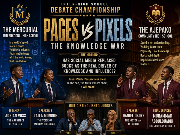 <p>In a world where attention is the new currency and information travels at the speed of a swipe, two high schools stand at opposing ends of the intellectual battlefield: </p><p><br/></p><p>THE MERCURIAL INTERNATIONAL HIGH SCHOOL </p><p><br/></p><p>and </p><p><br/></p><p>THE AJEPAKO COMMUNITY HIGH SCHOOL.</p><p><br/></p><p>On one side stands a school that believes the world has evolved beyond pages and ink, where influence is measured in reach, virality, and instant impact: THE MERCURIAL'S.</p><p><br/></p><p>On the other stands a school that remains the guardian of depth, structure, and the timeless discipline of written knowledge: THE AJEPAKO'S.</p><p><br/></p><p>I present to you the motion:</p><p>“Has social media replaced books as the real driver of knowledge and influence?”</p><p><br/></p><p>Today, ideas will clash. Perspectives will bleed. And in the end, the truth will not shout, it will stand.</p><p><br/></p><p>Moderators: before us today, we have our panel of distinguished judges:</p><p><br/></p><p>Prof. Emeka Nwafor</p><p><br/></p><p>Prof. Abdul Rahman Sani</p><p><br/></p><p>Prof. Amina Bello</p><p><br/></p><p>Each bringing depth, experience, and intellectual balance to this historic debate. please join your hands together and recognize their presence... thank you </p><p><br/></p><p>Each speaker has 5 minutes.</p><p><br/></p><p>SPEAKER 1, FROM THE MERCURIAL’S</p><p><br/></p><p>Let us begin not with sentiment, but with reality. The question before us is not whether books are valuable. The question is whether they are still the real driver of knowledge and influence in today’s world.</p><p><br/></p><p>And I say clearly, boldly, and unapologetically: they are not.</p><p><br/></p><p>Honourable judges, moderators, esteemed opponents, and everyone present. My name is Adrian Voss, The Architect of Virality, from THE MERCURIAL’S.</p><p><br/></p><p>I strongly support the motion because influence today is no longer slow, silent, or confined to pages. Influence is instant. It is visible. It is global.</p><p><br/></p><p>A single post can shape public opinion before a book chapter is even finished. A short video can teach millions before a textbook is even opened. so what are we saying ? </p><p><br/></p><p>And that is the world we live in.</p><p><br/></p><p>Books may contain knowledge, oh, yes!</p><p> but knowledge that is often locked, delayed, and limited by access and time.</p><p><br/></p><p>Social media, on the other hand, has broken those barriers. It has democratized information, removed gatekeepers, and placed knowledge directly into the hands of the people.</p><p><br/></p><p>And let us be honest yeah, what is the influence if not reached?</p><p><br/></p><p>A book read by thousands cannot compete with a message seen by millions in seconds.</p><p><br/></p><p>Influence is no longer about who writes the deepest truth, but about who spreads the loudest impact.</p><p><br/></p><p>We now live in an attention economy. And in this economy, visibility is power, virality is authority, and engagement is validation.</p><p><br/></p><p>Social media does not just share knowledge, it shapes perception. It builds movements. It decides what becomes important in real time.</p><p><br/></p><p>Books build thinkers in isolation.</p><p><br/></p><p>Social media builds societies in motion.</p><p><br/></p><p>And in a world that moves this fast, motion is influence.</p><p><br/></p><p>So I stand firmly: social media has not just changed how knowledge spreads it has replaced books as the real driver of knowledge and influence in today’s world.</p><p><br/></p><p>I am Adrian Voss. Thank you.</p><p><br/></p><p>Moderators: please let's put our hands together for Adrian Voss. Now may we call on stage...</p><p><br/></p><p>SPEAKER 1 FROM THE AJEPAKO’S</p><p><br/></p><p>Speed is not the same as understanding. Visibility is not the same as truth. And popularity is not the same as knowledge.</p><p><br/></p><p>Honourable judges, moderators, co-debaters, and my fellow students. My name is Daniel Okoye, The Historian of Truth, speaking for THE AJEPAKO’S.</p><p><br/></p><p>We stand firmly against the motion that social media has replaced books as the real driver of knowledge and influence.</p><p><br/></p><p>Yes, social media spreads information fast. But as our elders say, “what is quickly gathered is often quickly scattered.” Fast information is not always correct information. What spreads quickly is often simplified, incomplete, or misleading.</p><p><br/></p><p>Knowledge is not measured by how many people see it in seconds, but by how deeply it is understood and verified.</p><p><br/></p><p>Books remain the foundation of real learning. They are structured, reviewed, and built over time. They allow ideas to be developed carefully, not rushed for attention or reduced to likes, comments, share the lives and tap on your screen </p><p><br/></p><p>As another saying goes, “A river that forgets its source will soon run dry.” In the same way, any system of knowledge that abandons depth for speed will eventually lose its meaning.</p><p><br/></p><p>Social media, on the other hand, rewards emotion over accuracy. It rewards what is loud, not what is right. It can influence opinion, yes but influence without depth is fragile and often temporary.</p><p><br/></p><p>Real knowledge requires patience. Real influence requires trust. And both are built through depth, not speed.</p><p><br/></p><p>Books may not be fast, but they are reliable. They do not change with trends. They do not depend on algorithms. They preserve knowledge in its full form, not in fragments.</p><p><br/></p><p>As the elders also say, “The words of the wise are not lost in the wind.” Books carry that wisdom across generations without distortion.</p><p><br/></p><p>So while social media may spread ideas quickly, it has not replaced books as the true driver of knowledge and influence.</p><p><br/></p><p>It has only made noise easier to hear.</p><p><br/>