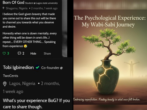 <p>Still on the experience</p><p>Still on my Wabi-Sabi journey......</p><p>The first piece ended at the moment I received the blow.......</p><p>The damage had already been done 😓, that same statement "SO YOU ARE A STAMMERER!!" pierced me deeply and I became fatally wounded....A WOUND THAT TOOK ITS TOLL ON ME FOR FOUR GOOD YEARS😪...</p><p>So after that moment at LSUBEB, going back was very quiet between my teacher and I, she was busy boiling but no one in the bus needed her anger, and as for me I was busy sulking privately because NO ONE NEEDED A STAMMERER. Flashback to other qualifying rounds, one of my teacher who taught me at Primary 4 will always be at the gate waiting, no matter how late we might be despite the fact that she was living very far away, she made it a tradition to wait behind to hear the outcome (which has now become a routine of success, so she was used to hearing that I qualified). So on this particular day, she was waiting as usual  but when she met my face...she knew something had happened, confirming from my teacher the bad news, she pulled me to a very deep hug different from the ones she always give me when we qualify, and I cried into her shoulders, she and my other teacher were thinking I was crying because we lost but they didn't know I was crying because I was called a STAMMERER in such a degrading manner.</p><p>My school compensated me with a gift (which I still possess till today) and one of my teacher's soothing days, she called me with an unusually gentle and slightly deep voice, calling my surname she said :</p><p><strong>"Oyinloye.......look at me</strong>"<strong> </strong>I did, and she said <strong>"NO ONE</strong><strong> can debate as you do". </strong>I understood she was trying to make me cheer up but it still didn't do the magic (though it did after four years). The statement of that female judge brought back jests and mockeries that I once disregarded and this time, as each of them keep playing in my head it will always end with that statement "SO YOU'RE A STAMMERER!!'. </p><p>Due to this, I fell into depression, (I didn't even know was called depression, but I knew I was down), now this is what I meant in the cover picture when I said "...when one is down mentally, every other thing will be down in one's life....". I scaled through my common entrance with this same mentality and I vowed NEVER TO BE OPEN, I vowed I WILL ALWAYS REMIND MYSELF I'M A STAMMERER so I won't dare to be one brilliant boy that'll be representing his school. It affected my academics and throughout my junior secondary school I kept dropping to the extent that my BECE(also called JUNIOR WAEC) result was close to failure, I was a shadow of myself spiritually, "WHY DID GOD CREATE ME AS A STAMMERER?" I always asked myself with anger , I became too playful (because in that way I believed I usually relieve myself) that I started acting as a mediocre both at school and at home....... Don't let me bore you with my past, let me stop here....</p><p>All this continued until ONE DAY.....</p><p>I had a discussion with my brother and myself..........</p><p>To be continued......</p><p>Next: My moment of transformation 😌</p>