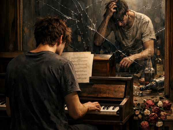 <p>“Da-da-da-da-da-da-dum”</p><p>“du-du-dum du-du-dum”</p><p>Like…</p><p>I’m here at the pianoforte again</p><p>Once again, I’m trying to play my pain away</p><p>Once again, I fail to make any change</p><p>My heart’s still feeling so much ache</p><p>And it’s not getting better in any way</p><p>“Du-du-du-dum”</p><p>“du-du-dum du-du-du-du-duu…”</p><p>Every day, I come back here again</p><p>Try to make some beauty of the pain</p><p>Some beauty of watching myself break…</p><p>Down and rebuild myself just so I can break again</p><p>I’m supposed to think back to memories of a happier time</p><p>Memories of a blissful nature, holding her hand</p><p>In the young of the night, she flashes a smile</p><p>I feel my heart beat fast, and then I tell her</p><p>She gives a bashful smile</p><p>And now I’m smiling inside</p><p>Without even realizing I’ve fallen for her</p><p>And the melancholy in the air is making me smile</p><p>Melancholy in the air making me shout</p><p>Melancholy in the air is making me cry</p><p>’Cause now all I have are sadder times</p><p>Where I’m debating whether or not to talk to her</p><p>Hands over the keyboard, should I send a “hi”?</p><p>Will talking to her fix me or break me inside?</p><p>Is it worth the risk, or should I just leave?</p><p>And I swear I want to love her unconditionally</p><p>But love is like chess, except she’s not the queen</p><p>She’s the black trying to take over the white</p><p>And I don’t know her next move, so I prepare in advance</p><p>Then she hopelessly checks on my king</p><p>And says checkmate, knocking my heart down as she takes the win.</p><p>“Da-da-da-da-da-da-dum”</p><p>“du-du-dum du-du-dum”</p><p>Like…</p><p>I’m back again</p><p>I’m hitting the keys again</p><p>They sound nice to me, but they’re giving you a migraine</p><p>That’s ’cause you weren’t supposed to see this</p><p>It’s my pain, so I’ll carry it till my back strains</p><p>Okay, that’s all now, you can leave this</p><p>I definitely didn’t write this so you can read it</p><p>I’m definitely not ever going to show this</p><p>But just in case you read this,</p><p>I need you to take me away from the keys</p><p>’Cause every time I hit them, I break a piece of me</p><p>And quick, before I end up losing me.</p><p>“Da-da-da-da-da-da-dum”</p><p>“du-du-dum du-du-dum”</p>