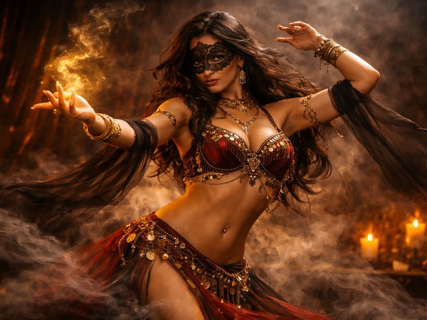 <p></p><p>She steps in.</p><p></p><p>Her body moving like the flow of a river—</p><p>Or is she the river's daughter?</p><p>From her lower belly up, air moves like she's being choked.</p><p>Her body shines—</p><p>All that glitters is not gold…</p><p>But she is gold.</p><p></p><p>Hips whisper secrets only the floor understands.</p><p>Hands trace arcs like fire in slow motion,</p><p>Fingers circling in the wind, drawing a sigil.</p><p></p><p>Her eyes, above the mask, dare the shadows to follow her.</p><p>Every sway a promise, every tiptoe a spell.</p><p></p><p>The room bends to her rhythm.</p><p>Heartbeats sync with the tremble of her spine.</p><p>Even silence leans in to watch.</p><p>For she dances not with her eyes—</p><p>But for the fever she awakens inside them.</p><p></p><p>Her hair flows with the sway of trees dancing in the wind,</p><p>Each movement a calling,</p><p>and the unseen leans closer.</p><p>Your heart yearns for her touch—</p><p>Alas! She warms only those who desire her most.</p><p></p><p>You call her dance,</p><p>But her initials spell THE SEDUCTRESS.</p><p></p><p></p><p></p><p></p><p></p><p></p><p></p><p>WILDCARD\\\\ PEACE OUT </p><p></p><p></p><p></p><p></p><p></p><p></p><p> </p><p></p>
