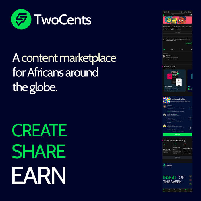TwoCents is a community and content marketplace for Africans around the globe.